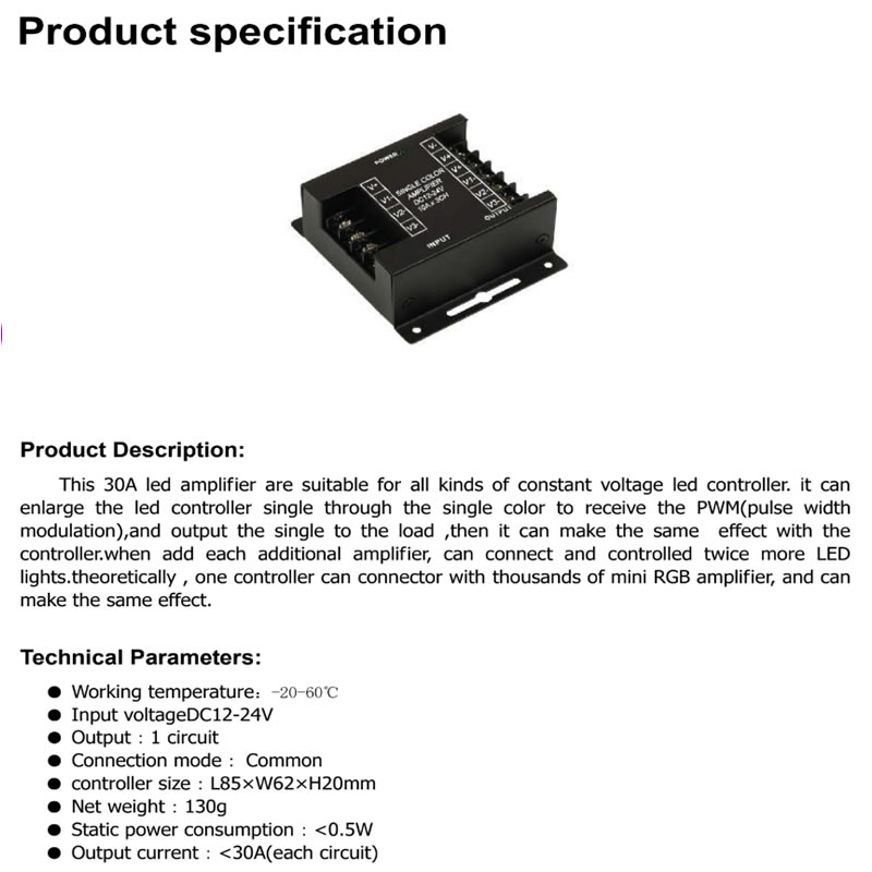 - Bu 30A LED amplifikatör, her türlü sabit voltajlı LED kontrol cihazı için uygundur.