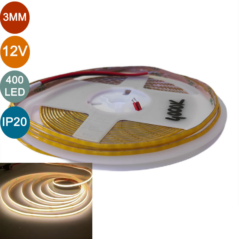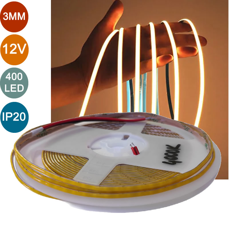 - 12V 3mm COB Şerit Led, yüksek LED yoğunluğu sayesinde noktasız ve homojen ışık sağlayan yeni nesil aydınlatma çözümüdür.