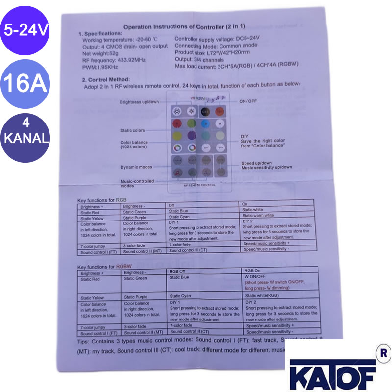 - Maksimum Çıkış Gücü : RGB: 3X5 A / RGBW: 4X4 A