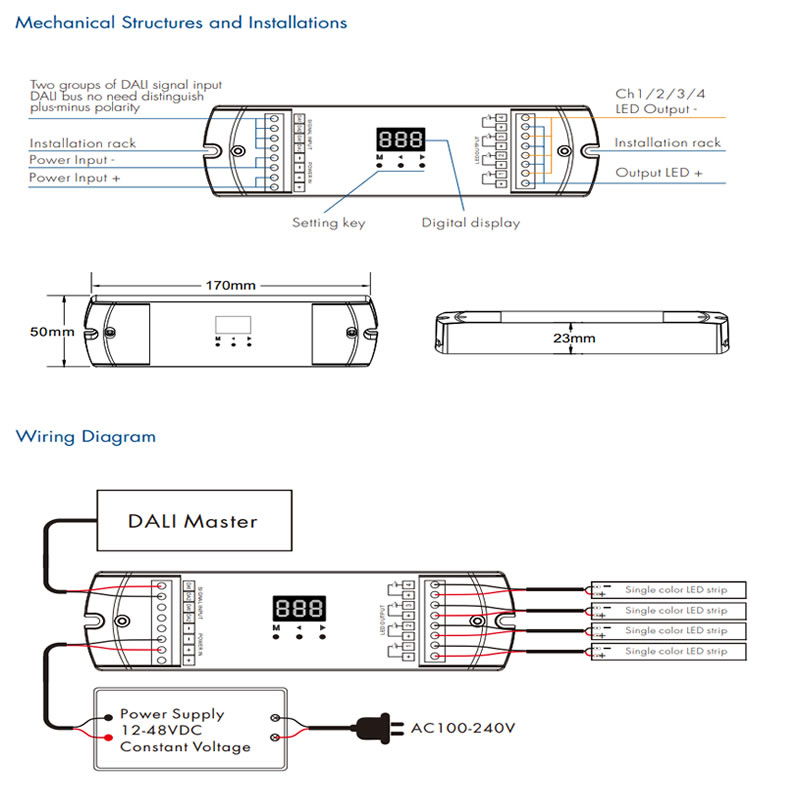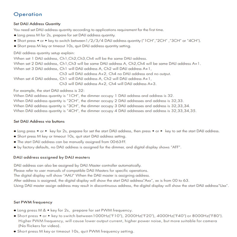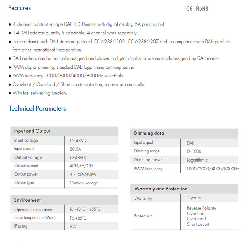 • DA4-L’de 4 ayrı çıkış kanalı vardır ve her kanal 5 A akım kapasitesine sahiptir. Böylece aynı anda dört ayrı LED grubu veya bölümü ayrı ayrı kontrol edilebilir.