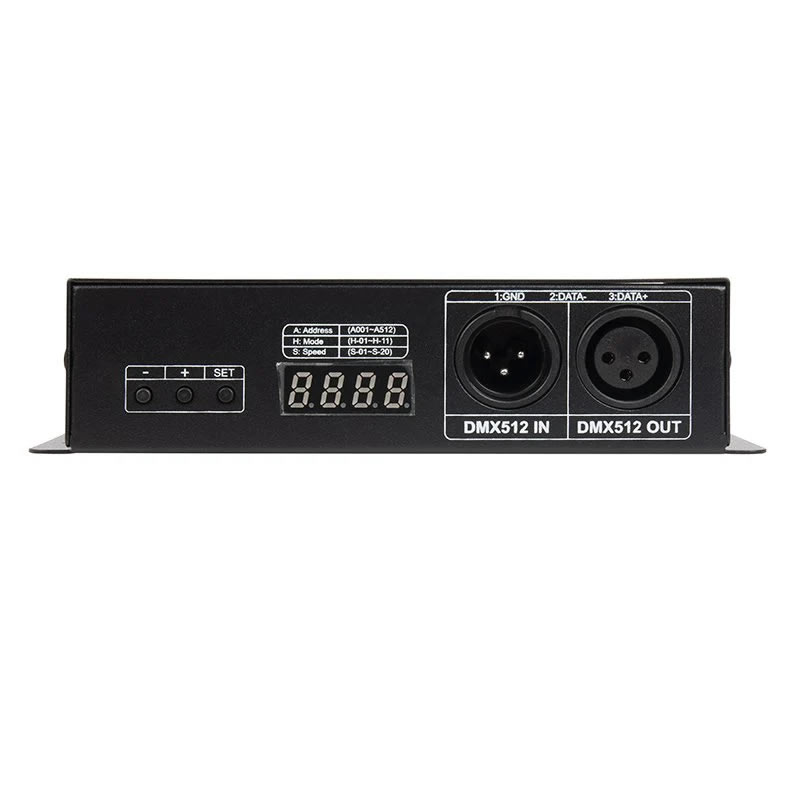 - Bir erkek ve bir dişi XLR3 konnektörü içerir.4 kanallı LED DMX Dekoder, DMX512 sinyallerini tek renkli, ayarlanabilir beyaz, RGB veya RGBW LED şerit ışıklarına ve armatürlerine çevirir.